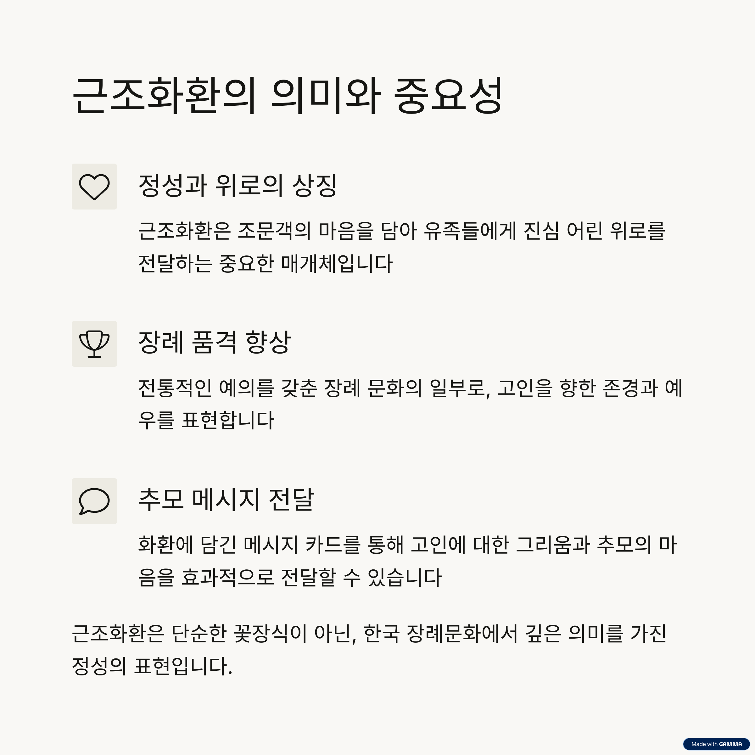 근조화환은 일반적으로 국화, 백합, 리시안셔스와 같은 흰색 계열의 꽃으로 구성되며, '삼가 고인의 명복을 빕니다'와 같은 문구가 적힌 리본이 포함됩니다. 주문 시에는 고인의 성함, 빈소 번호, 유족 이름, 장례 일정 등을 정확히 파악한 후 전달해야 정확한 배송이 가능합니다.