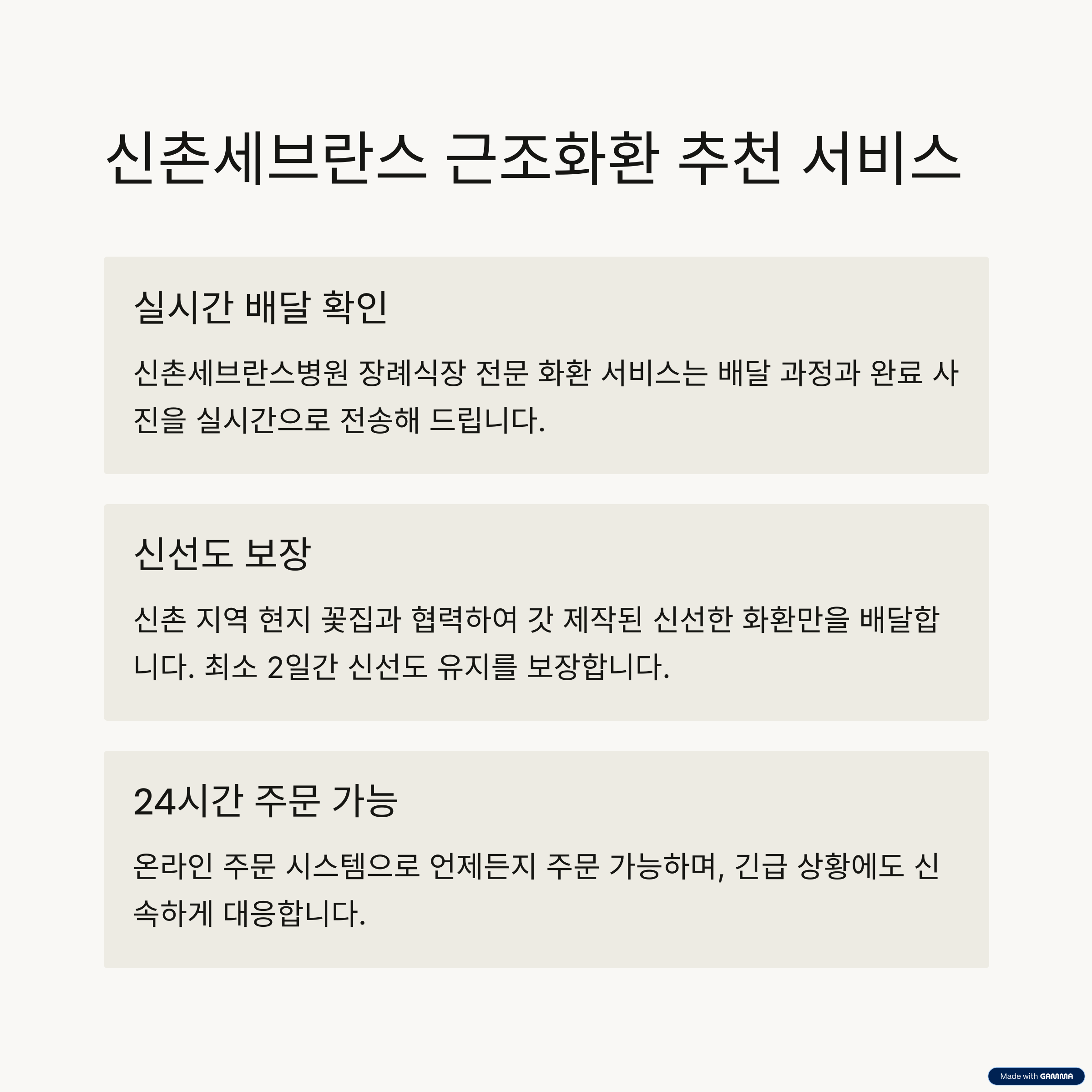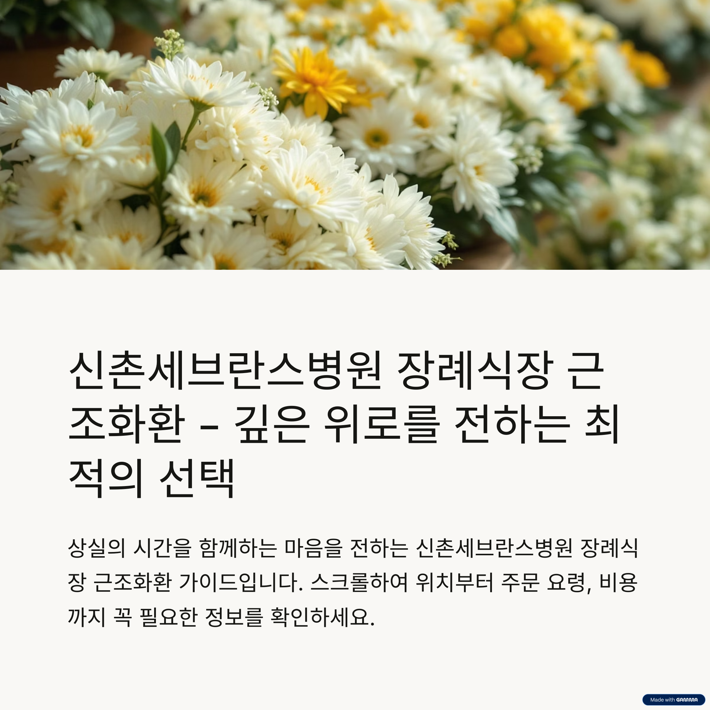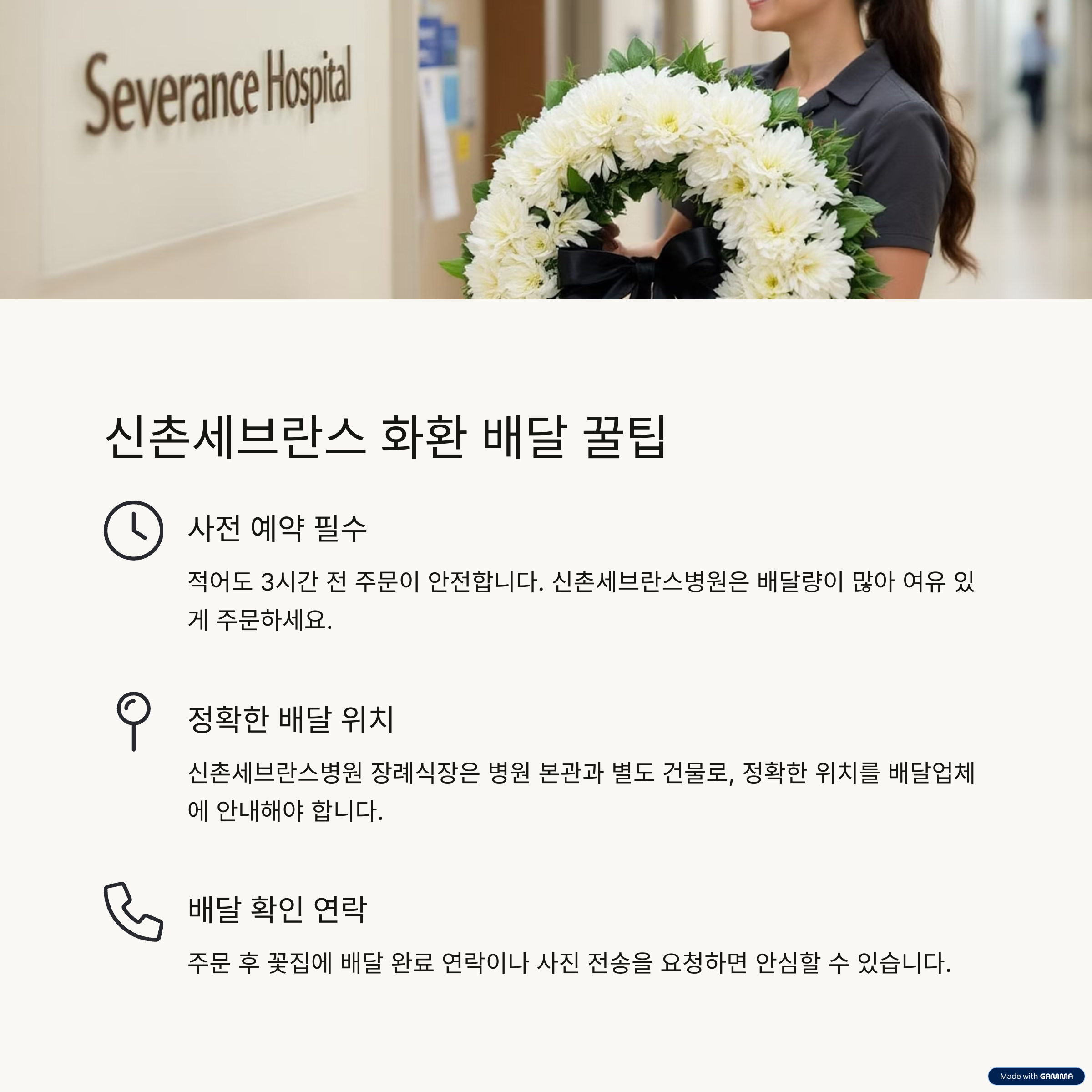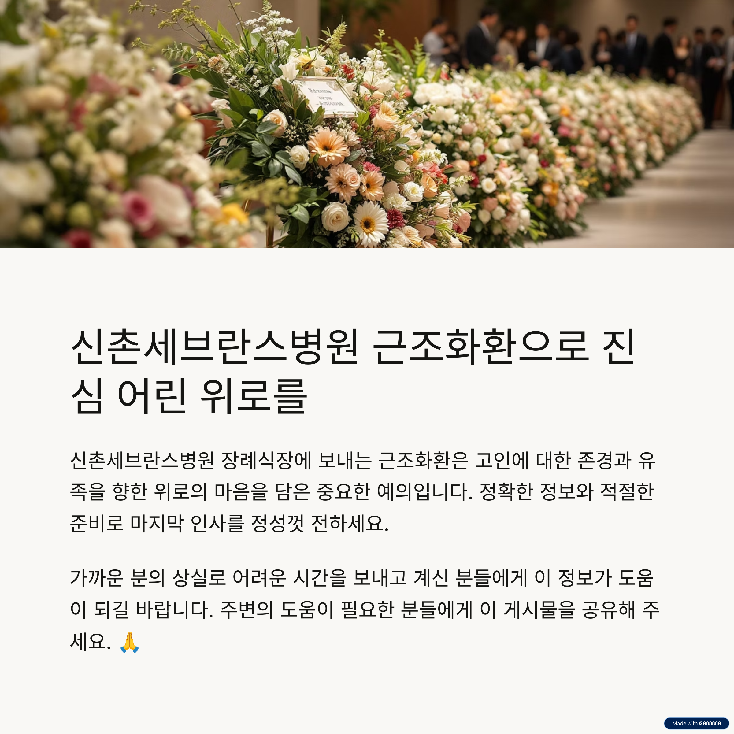 서울 서대문구에 위치한 신촌세브란스병원 장례식장은 하루에도 수많은 조문객이 방문하는 서울 서북부 대표 장례시설입니다. 고인의 마지막 길을 정중히 배웅하고 유족에게 위로를 전하기 위해 근조화환은 빠질 수 없는 예의의 상징입니다. 하지만 장례식장마다 공간, 절차, 배송 조건이 다르기 때문에 정확한 정보를 바탕으로 준비하는 것이 중요합니다.