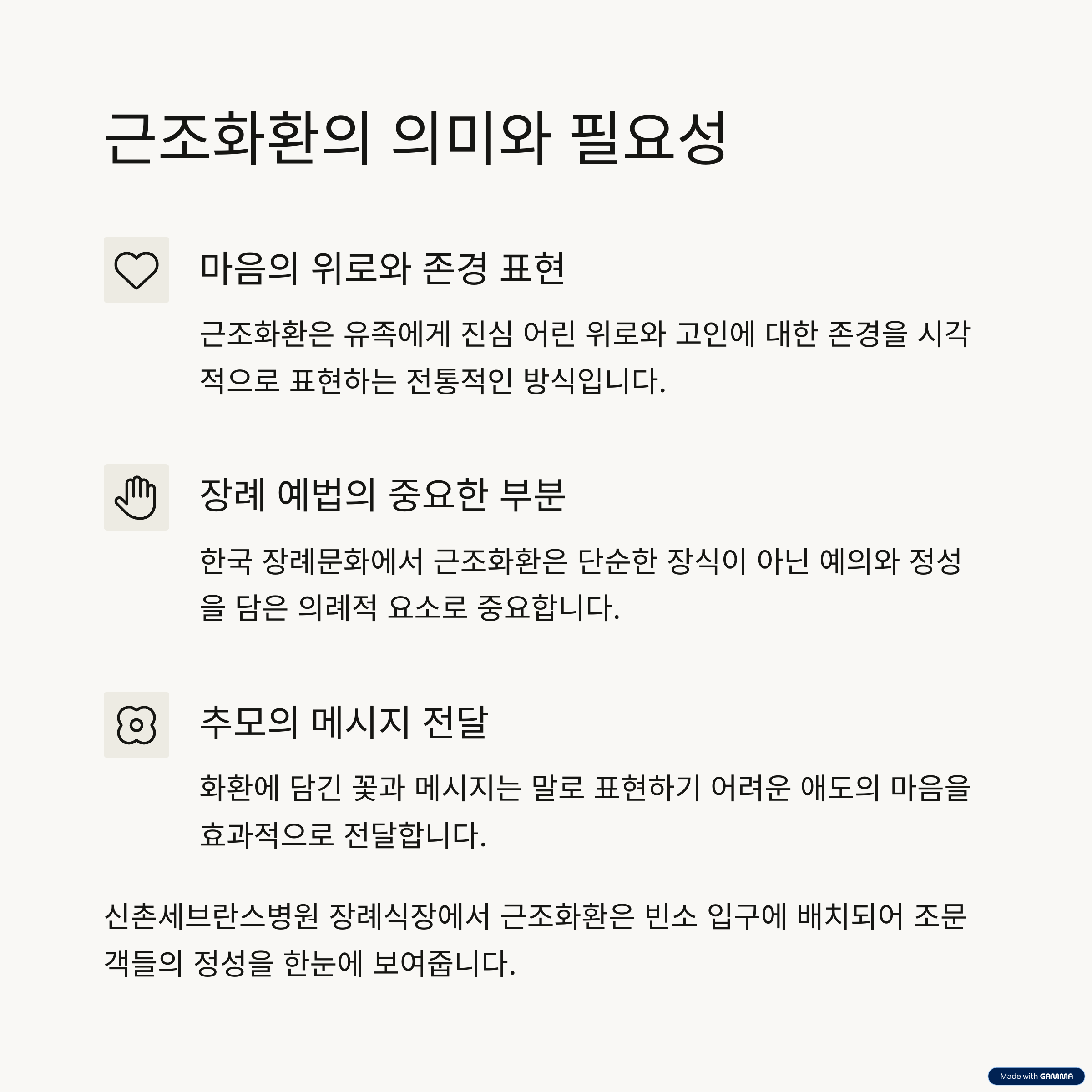 신촌세브란스병원 장례식장은 고인을 마지막으로 보내는 엄숙한 장소입니다. 단순히 예의로 보내는 것이 아니라 진심이 담긴 조의를 전달하기 위해서는 근조화환 선택과 배송 방식에 섬세한 배려가 필요합니다. 본 글이 신촌세브란스병원 장례식장에 근조화환을 보내려는 분들께 실질적인 도움이 되기를 바랍니다.