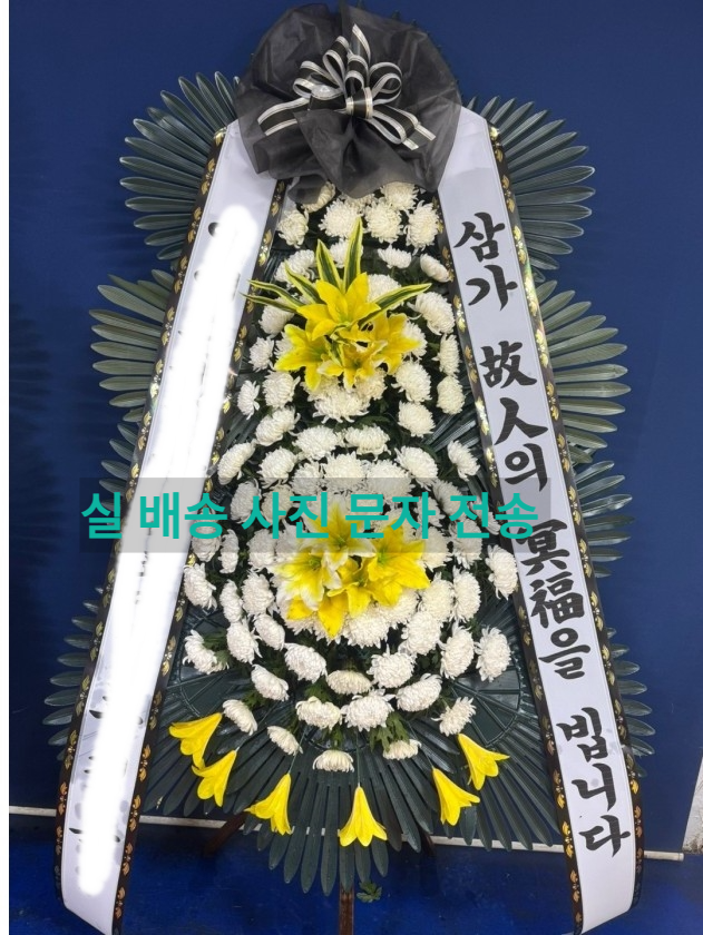 - 오른쪽 리본: 애도의 문구를 적습니다. (예: 삼가 故人의 冥福을 빕니다)